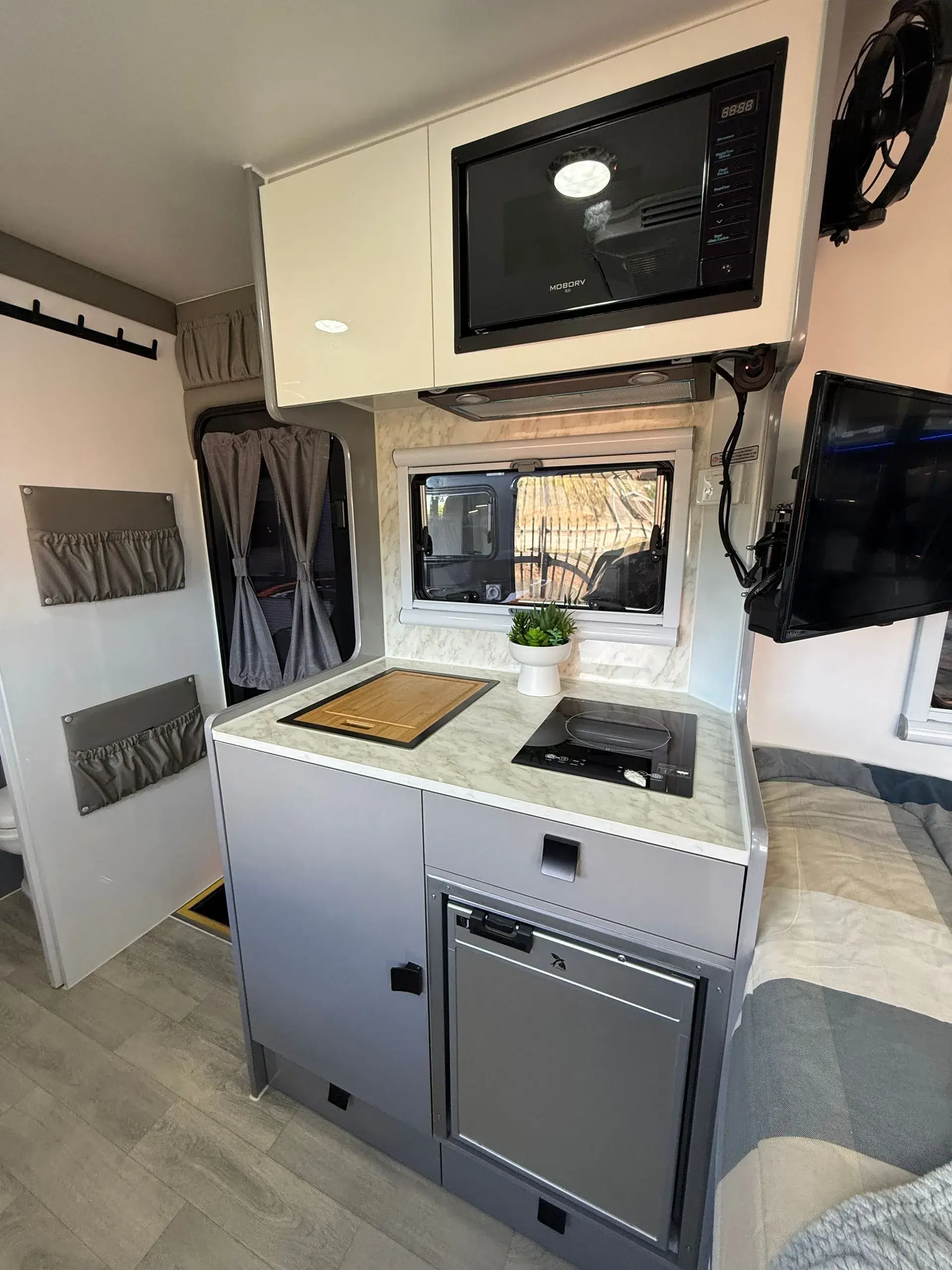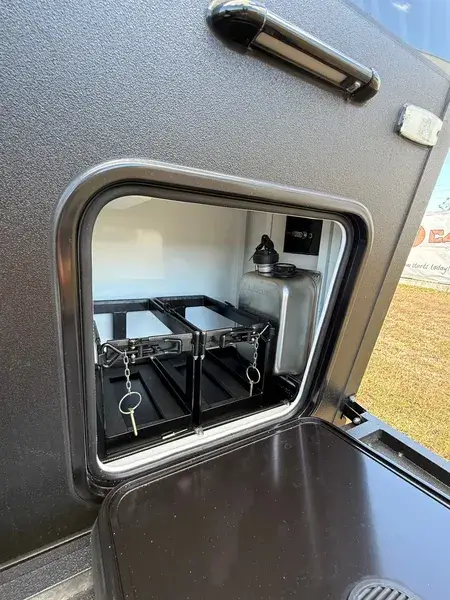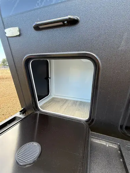 - Inside/ Outside rolling pantry (pass through storage hatch)